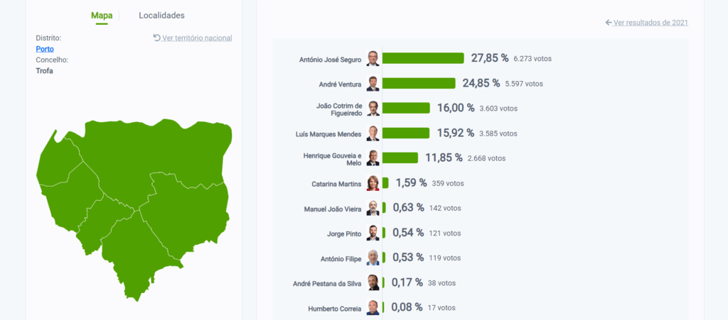 No Muro, a vitória foi de António José Seguro, com 27,65%, enquanto André Ventura obteve 21,83%. Marques Mendes (18,92%) ficou em 3.º.