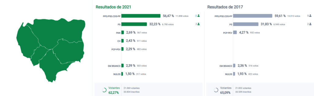 Na Assembleia Municipal, em 2021, a coligação de direita assegurou igualmente a maioria absoluta, com 51,95% dos votos e 12 mandatos, enquanto o PS conquistou 32,46% e oito lugares. O PAN obteve 4,92% e conseguiu eleger um representante pela primeira vez, ao passo que a CDU (3,24%) perdeu o assento e o Chega (3,07%) não conseguiu estrear-se na eleição.