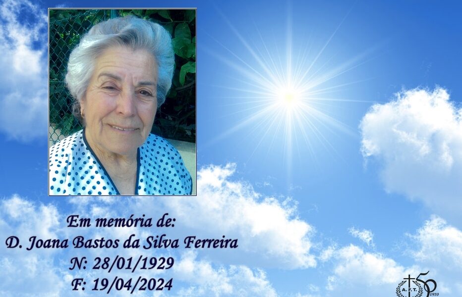 Faleceu Joana Bastos da Silva Ferreira, com 95 anos, viúva de Avelino Guiomar Dias de Sá. Dados das cerimónias fúnebres: Velório: Funeral: Cemitério: Missa de 7º dia: