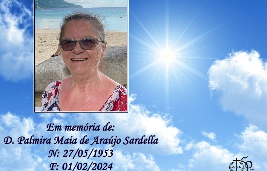 Faleceu Palmira Maia de Araújo Sardella, com 70 anos, falecida na Suíça – esposa de Robert Sardella e filha da falecida Isaura da Agra Velha. Dados das cerimónias fúnebres: Velório: Funeral: Cemitério: Missa de 7º dia:
