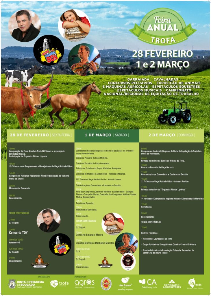 A Feira Anual da Trofa está de volta nos dias 28 de fevereiro, 1 e 2 de março, trazendo um programa recheado de atividades que celebram a tradição equestre e pecuária da região. O evento, organizado pela Junta de Freguesia de Bougado, promete atrair visitantes de várias localidades para assistir a concursos, demonstrações e espetáculos musicais.