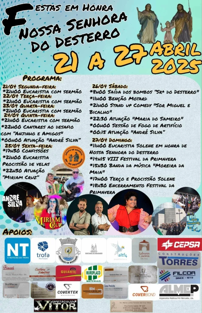 Começam hoje as tradicionais Festas em Honra de Nossa Senhora do Desterro, uma das celebrações religiosas e culturais mais emblemáticas da freguesia de Santiago de Bougado. As festividades prolongam-se até ao próximo domingo, dia 27 de abril, prometendo uma semana recheada de fé, animação e convívio.