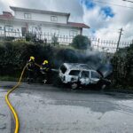 Um veículo ligeiro foi consumido pelas chamas, na tarde deste sábado, na Rua das Indústrias, em Lantemil, Santiago de Bougado, após um despiste seguido de embate contra um muro.