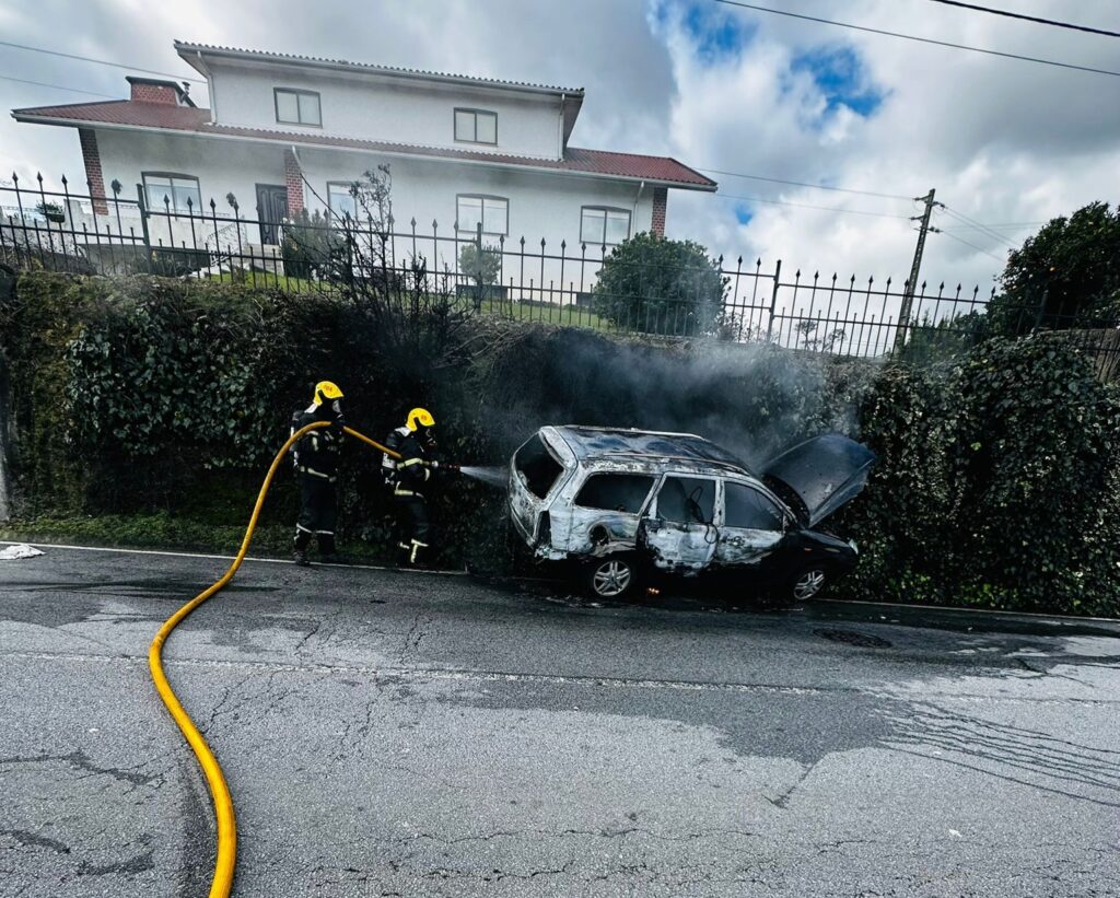 Um veículo ligeiro foi consumido pelas chamas, na tarde deste sábado, na Rua das Indústrias, em Lantemil, Santiago de Bougado, após um despiste seguido de embate contra um muro.